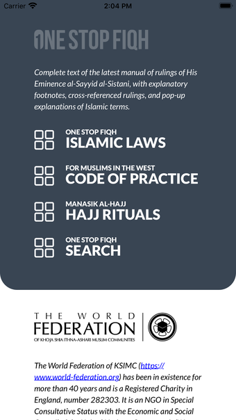 De app is ontwikkeld door The World Federation Of Khoja Shia Ithna-Asheri Muslim Communities en is het resultaat van jarenlange inspanningen van hun Islamitische Educatie Afdeling. De applicatie maakt gebruik van een goed ontworpen interface en biedt gebruikers een uitgebreide en goed onderzochte bron van kennis. Dit maakt One Stop Fiqh een essentieel hulpmiddel voor iedereen die zich wil verdiepen in de islamitische jurisprudentie en de praktische toepassing ervan in het dagelijks leven.